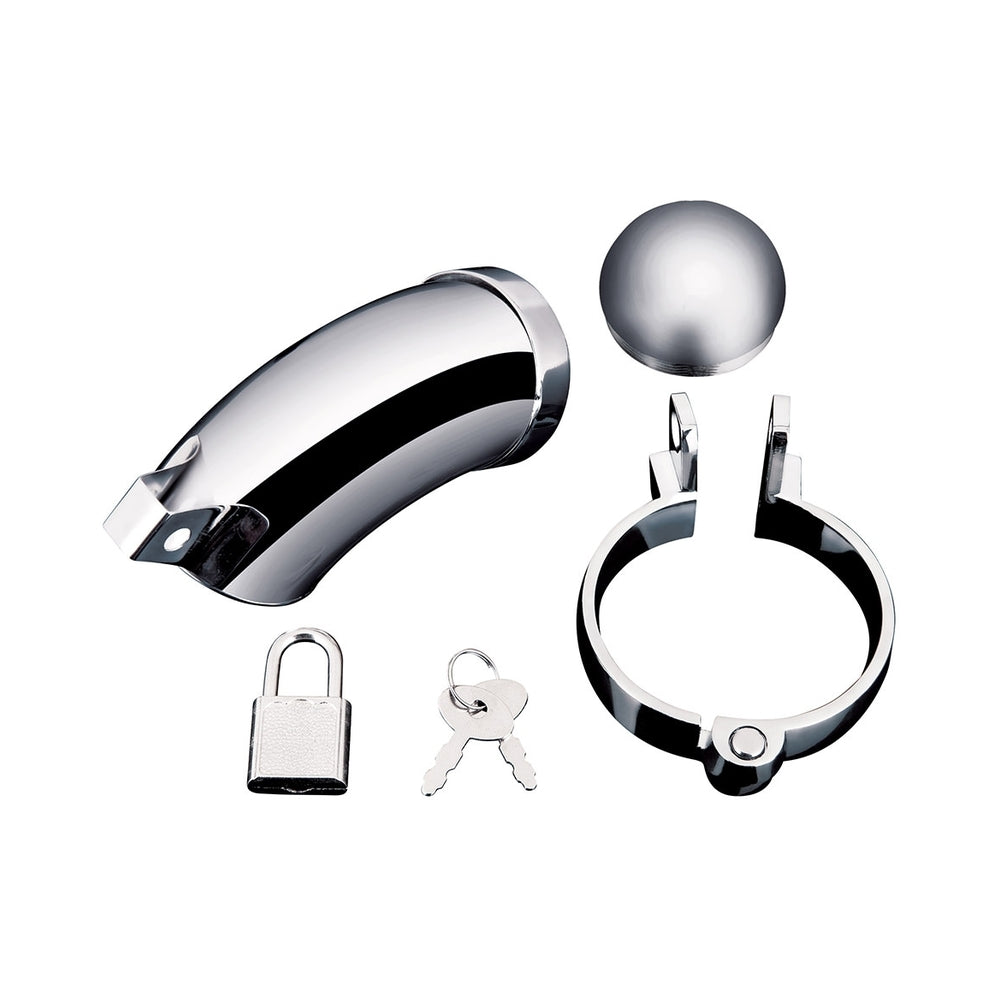 Put your partner in their place with the Total Submission Cock Cage! Keep them from getting too hard with the solid metal sheath that surrounds their penis, and make sure they won”t go anywhere with the ring that secures around their testicles. Perfect for exploring BDSM play and experiencing the intense orgasm that follows when it”s been denied. Got somethin” kinky in mind? We”ve got you covered! Curved, Ergonomic Design Easy To Attach 3-piece Set Comfortable For Long-term Wear Includes Padlock & Key Made Of Body-safe Metal Material: Stainless SteelItem Length: 4.13 in.Item Width: 2.36 in.Item Height: 3.54 in