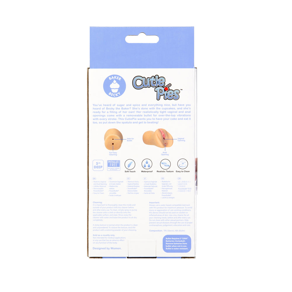 Meet the CutiePies: a collection of lifelike masturbators all with their own passionate personas. These ladies are made with ultra-soft TPE material and are all equipped with realistic openings for endless stroking. Easy to clean, perfectly sized and better than real, you’ll fall in love with CutiePies! You’ve heard of sugar and spice and everything nice, but have you heard of Becky the Baker? She’s done with the cupcakes, and she’s ready for a filling of her own! Her tight vaginal and anal openings are 5 inches deep, uniquely textured and open ended for easy cleaning. An added hole perfectly fits the included removeable bullet for over-the-top vibrations with every stroke. Made from soft and supple TPE material that is 100% body safe and provides the upmost lifelike experience, once this baker is done with you, you’ll be wondering whether or not she’s the real deal! Becky’s compact size makes her easy to bring with you anywhere, for stroking around the clock! This CutiePie wants you to have your cake and eat it too, so put down the spatula and get to beating! Key Features: Masturbator Tight Vaginal & Anal Openings 5in. Deep Removeable Vibrating Bullet Textured for Added Stimulation Soft & Supple TPE Material Compact Easy to Clean
