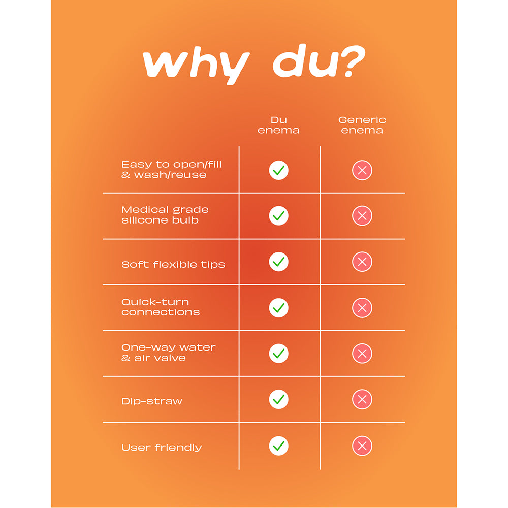 Du is the premium douching experience, designed for effortless functionality and usability. An easily removable cap and wide opening are made with quick filling and cleaning in mind. The FDA-grade silicone bulb fits every hand seamlessly and is the ideal capacity to prevent over douching. Our soft tips ensure a hygienic use and feature a quick-turn connection . Included air/water valves prevent back-flow and allow for uninterrupted use of all the water without having to remove and reinsert. An exceptional experience thoughtfully designed with every user in mind.Du is made for douching and cleansing, including preparation before and after play. Easy to Open and Fill – Quick-turn locking cap with ergonomic gripping feature and a large opening for fast filling Back-Flow Free Design – One-way air/water valves prevent air from entering your system and prevent back-flow Ergonomic – Dip straw allows for use standing up and can be removed Replaceable Tips – Soft flexible tips are easy to remove and replace with a quick-turn connection. Simply wash & reuse or replace with new one. Kit includes 2 tips Ideal Capacity – Soft silicone bulb with 6oz/180ml capacity Premium Materials – Medical-grade silicone bulb and BPA & phthalate free components