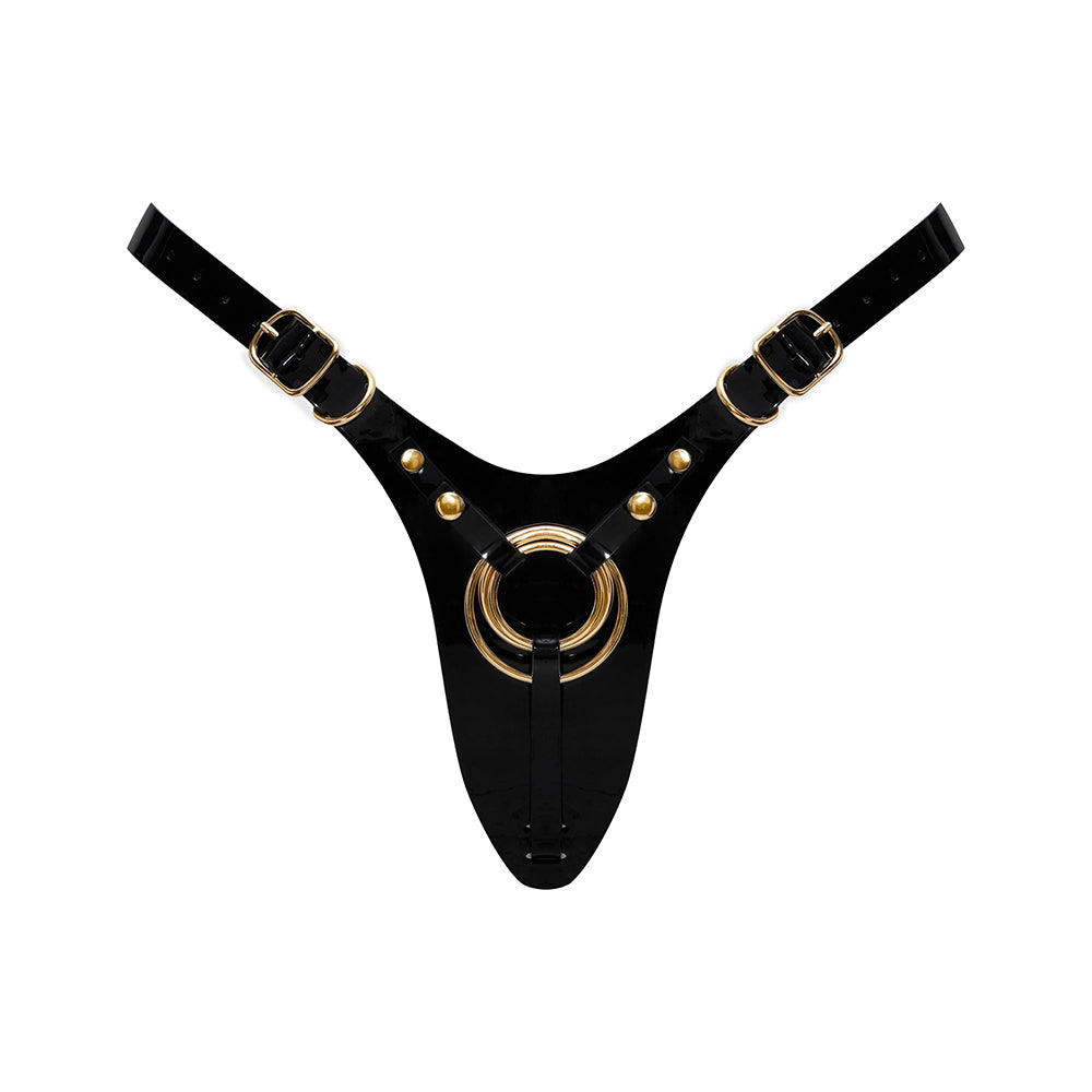 This stylish faux-leather harness is designed for a perfect fit with fully-adjustable waist and leg straps that cinch smoothly for a secure and comfortable feel. A strap-on ring fastened by three riveted buckles keeps toys in place during play. Made from PVC and polyester (buckles made from ABS) Fully adjustable straps around waist, thighs, and lower back Fits up to 60in. waist 2in. PVC rubber ring to attach toy Waterproof Vibrating finger ring included