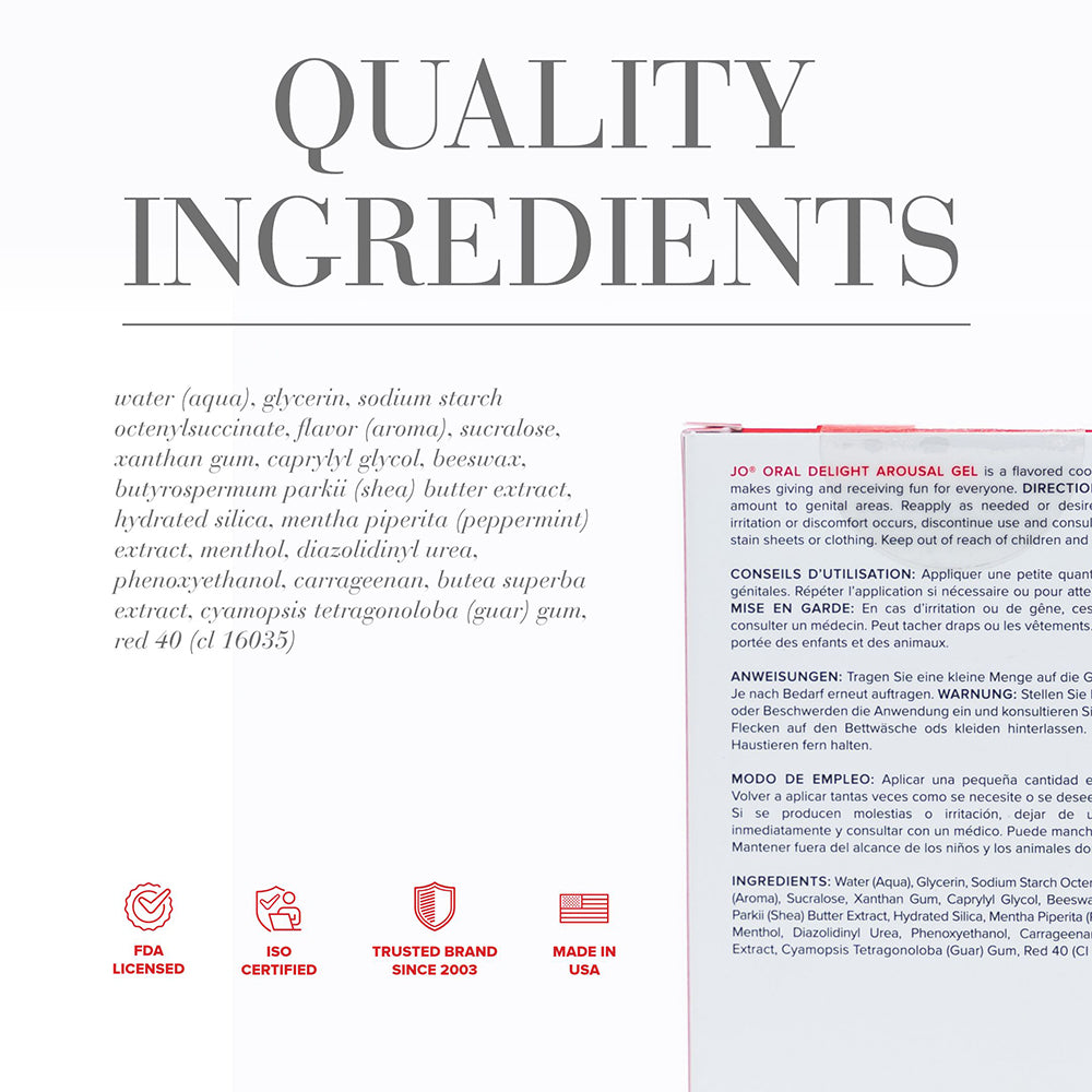 JO Strawberry Oral Delight Arousal Gel is our water-based, flavored stimulant thatft.s perfect for oral play of all kinds. Its thick formula is great for extended use, stays where you put it, and offers a fruity cooling tingle that lasts as long as you do. Thick Water-Based Formula Great For Extended Use Stays Where You Put It Fruity, Cooling Tingle Perfect For Solo & Partner Play Compatible with Most Toys & Condoms Made in the USA FDA Licensed ISO Certified 100% Pleasure Guarantee Ingredients: Water (Aqua), Glycerin, Sodium Starch Octenylsuccinate, Flavor (Aroma), Sucralose, Xanthan Gum, Caprylyl Glycol, Beeswax, Butyrospermum Parkii (Shea) Butter Extract, Hydrated Silica, Mentha Piperita (Peppermint) Extract, Menthol, Diazolidinyl Urea, Phenoxyethanol, Carrageenan, Butea Superba Extract, Cyamopsis Tetragonoloba (Guar) Gum