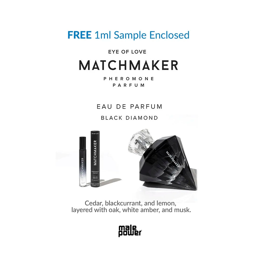 From The Matchmaker collection–a bold collaboration between Male Power Underwear and Eye of Love–comes a daring twist on the bestselling ring jock thong. This innovative jock features a discreet front pocket on the pouch, perfect for a condom or small keepsake. Metal rings in back and supportive elastic bands deliver a firm, butt-lifting fit that commands attention. Each garment includes a 1ml sample of Eye of Love”s Matchmaker Black Diamond pheromone cologne to enhance your allure and make your presence unforgettable.Fabric Content: 85% Polyamide, 10% Polyurethane, 5% Spandex