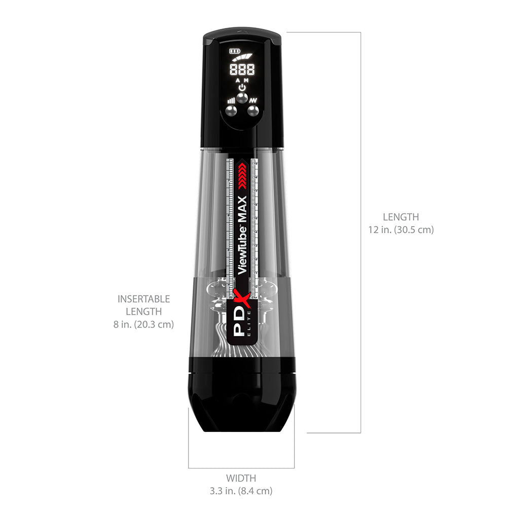 The PDX ELITE VIEWTUBE MAX VIEW elevates masturbation with powerful intermittent sucking for the ultimate stroker experience. It”s a perfect storm of sensation for heightened solo sex sessions that can be customized to your personal moods! Get ready for explosive push-button cock-sucking, surrounding your penis with ultra-soft automatic sucking action! So what are you waiting for…Stick it in and view your cock magnifying to the MAX! Intermittent SUCTION Technology: The ultra-strong motor provides 4 patterns of pleasurable suction modes. Intermittent sucking automatically sucks your penis into the ultra-soft sleeve for pleasures beyond your wildest dreams! Personalize Your Suction: Enjoy 4 modes of automatic intermittent suction patterns, or manually control the suction patterns yourself! Increase the suction pressure to maximize stimulation to your penis, to tease and please! Ultra-Soft Sleeve: The extraordinary feel of the ultra-soft sleeve caresses your penis with every suck from the powerful motor. The unique texture wraps around your entire shaft while the ViewTube Max View automatically strokes and vibrates for mind-blowing stimulation! Viewtube – Max view Sleeve: See yourself like never before! Stick it in and view your cock magnified to the max! Illuminated LED lights: Add to the fun and watch your manhood get showered with an array of colored lights as you get stroked and sucked! USB Magnetic Recharging: Ready when you are! Easily and conveniently rechargeable with included magnetic charging cord, offering hours of enjoyment. Specifications: Materials: ABS Plastic, Polycarbonate, and TPE Item Length: 12.0 in. (30.5 cm) Item Width: 3.3 in. (20.3 cm) Item Weight: 1.4 lbs. (0.6 kg) Special Features: Splashproof, Suction IPX Rating: IPX6 Modes: 4 Suction Modes, 4 Patterns Warranty Period: 1-Year Limited Warranty Battery Type: Rechargeable Charge Time: 2.5 hrs. mins. Charger Type: Magnetic/USB-A Package Includes: (1) Stroker, (1) Replacement O-Ring, and (1) USB Charging Cord, (1) Printed Instruction Manual Included