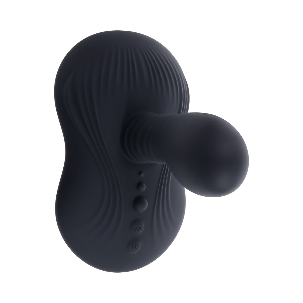 What are you doing tonight? Oh, I”m just Sittin” & Spinnin”… Meanwhile, you”ll actually be experiencing deeply satisfying orgasms with this unique vibrating, spinning remote-controlled toy. Secure the powerful suction cup base to a clean surface, then take a seat on the bulbous, textured shaft that rests on a chunky, vibrating grinding pad with raised nubs right where you want them most. With 9 rhythms of vibration and 3 spinning speeds, the sensations keep coming in unforgettable waves of pleasure, even under water as this toy is fully submersible. Play with me (key feature): Vibration and Spinning, 35” range remote Vibration: 3 speeds and 6 rhythms, 3 spinning speeds Material: Body-safe Liquid Silicone and ABS, Phthalate and Latex free Waterproof and Submersible: Yes Warranty: Five years Rechargeable: USB cables included Height: 4.75″, Depth: 6″, Width: 3.88″ Insertable length 3.75″, Insertable diameter 1.75″