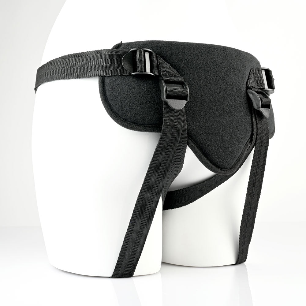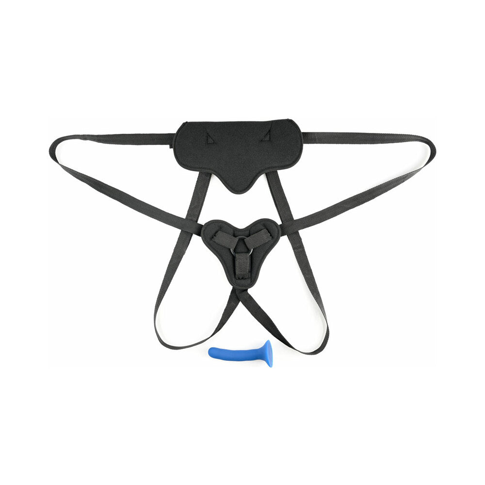 The velvet-texture harness”s adjustable nylon straps ensure a perfect fit up to 72″ (183 cm) hips, while padded front and back panels protect your sensitive areas during vigorous play. This set includes a slim, 5.25″ silicone dildo perfect for exploring, and secures via an interchangeable 1.25″ rubber O-Ring. A built-in pocket in the front panel makes space for your favorite bullet vibe (not included). Add our assorted O-Rings to fit any toy with a flared base. So don”t be afraid to browse our selection of body-safe dildos. The harness is machine washable making cleanup a breeze!Perfect for any New Comer to strap-on play! Padded for comfort and includes a slim, silicone dildo that”s ideal for new exploring couples.Size: waist 72″ (183 cm) 5.25″ silicone dildoIncludes: 4-Way adjustable harness fits up to 72″ hips (183 cm), Interchangeable rubber O-Ring 1.25″ (3.2 cm), 5.25″ silicone dildoHarness Materials: 40% polypropylene, 30% polyester, 15% polyurethane foam, 5% hook and loop, 3% ABS plastic, 2% nitrile O-ring Dildo Materials: 100% silicone