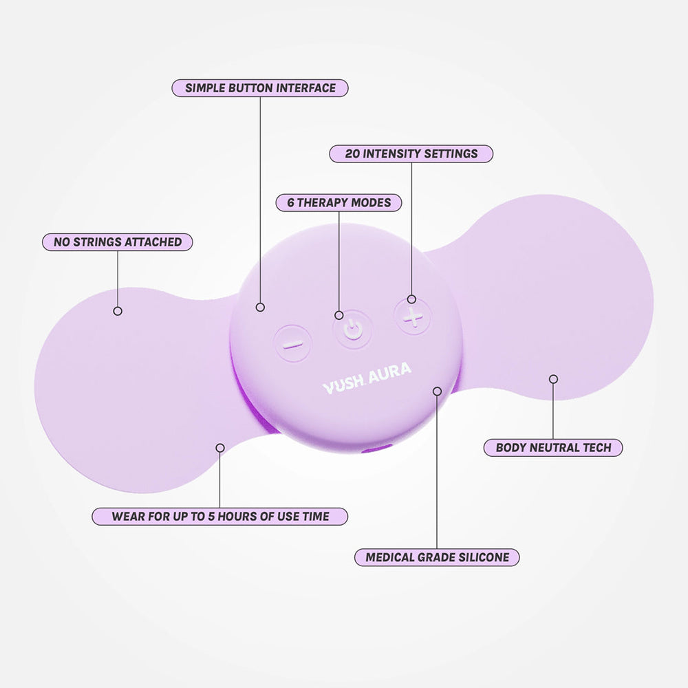 Meet Aura–the wireless, rechargeable purple TENS device designed to soothe period pain and help you feel your best. Compact and easy to use, Aura delivers gentle, targeted pulses to ease cramps and tension, and the sleek travel case makes it perfect for relief wherever you go. Our Vush fam says: “A lifesaver for my cycle–works like magic!” and “Stylish, discreet, and so effective!” With FREE shipping* and a minimum 1-year warranty (with replacement or store credit*), now”s the time to upgrade your period care routine. Shop Aura now and experience comfort that travels with you!Aura is a transcutaneous electrical nerve stimulation (TENS) machine. It provides painless electro currents that feel like gentle buzzing pulses to help relieve pain. These pulses trick your pain receptors into letting your muscles relax, help calm your overexcited nerves, and encourages endorphins for a happy body and mind. It sticks to your body using gel pads, which can be placed anywhere near the pain for targeted relief.The single patch design means there”s no messy cables under clothes to deal with. It”s just a single unit for quick, portable, drug free, and side effect free pain relief at the touch of a button. Device Name: TENS Model: SM9187 Power Supply: 3.7V, 180mAh Battery: 3.7V/180mAh Polymer Rechargeable Battery Battery Duration: About 10-12 cycles Weight: 0.85 oz. (24g) Charging Voltage: 5V Fully Charged: Approx. 40 min Duration: Approx. 300 min Device Intensity: 20 levels Max. output: 2.5w Material: ABS + Silicone Stimulation modes: 6 Size of Device: 6.3″ L x 2.3″ W x 0.5″ H (160 L x 58 W x 12.5 H mm)